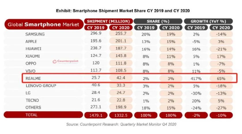 那么,拿着连续两年全球第一增长率、2020年65%增长率、4240万销售量数据、全球第七大智能手机品牌的成绩,走进2021年的Realme还有机会么?