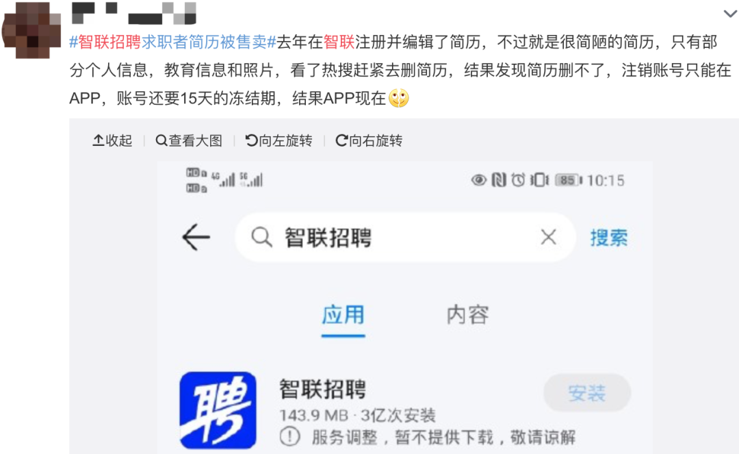 更夸张的是,用户看到315的热搜去删简历,结果发现简历还无法删除。