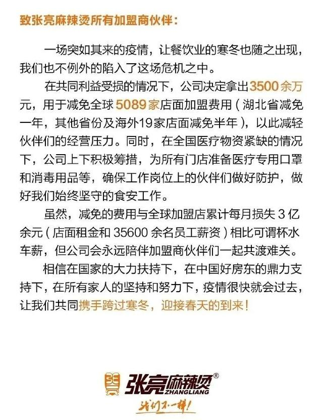 为了帮助加盟商挺过疫情的寒冬,张亮麻辣烫也拿出了3500余万元,用于减免全球5089家店面加盟费用(湖北省减免一年,其他省份及海外19家店面减免半年)。