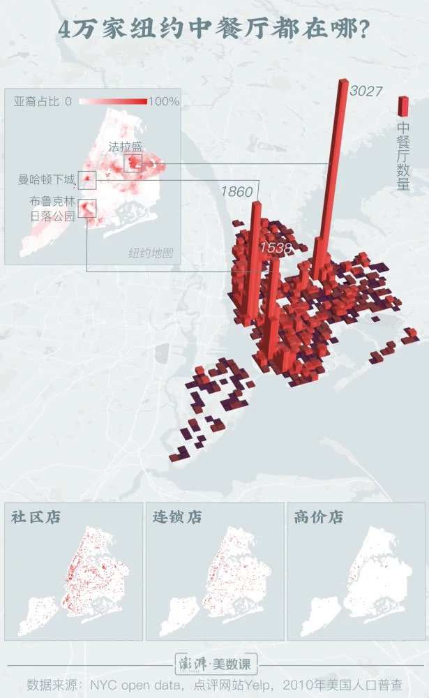 以美国的纽约为例,澎湃新闻此前抓取了国际点评网站Yelp和NYC open data的数据(见下图),在纽约的华裔聚集地主要分为三大区——曼哈顿下城、皇后区法拉盛和布鲁克林日落公园,都是中餐厅选址的热门之选。