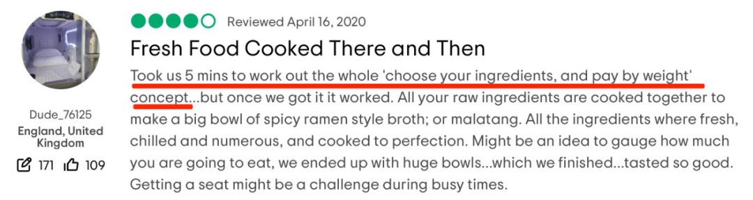 虽然张亮麻辣烫海外门店中,已经有明确的英文内容标示出每一个步骤应该怎么做,但是我们注意到,还是有老外客人在TripAdvisor上点评称,他们花了5分钟才弄明白DIY称重计价的方式。