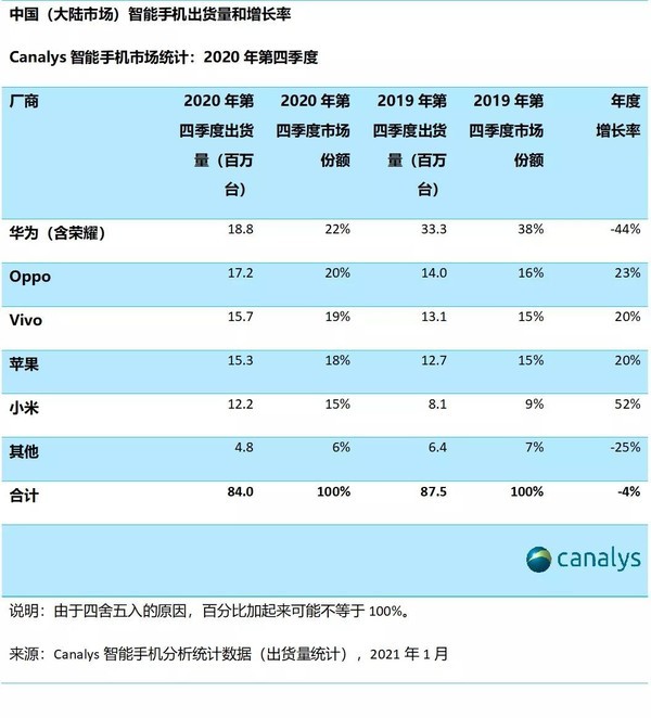根据Canalys数据机构,发布的《中国2020年第四季及全年的手机出货量数据》显示。2020年中国市场第四季度手机出货量同比下降4%;而2020全年出货量同比下跌11%。