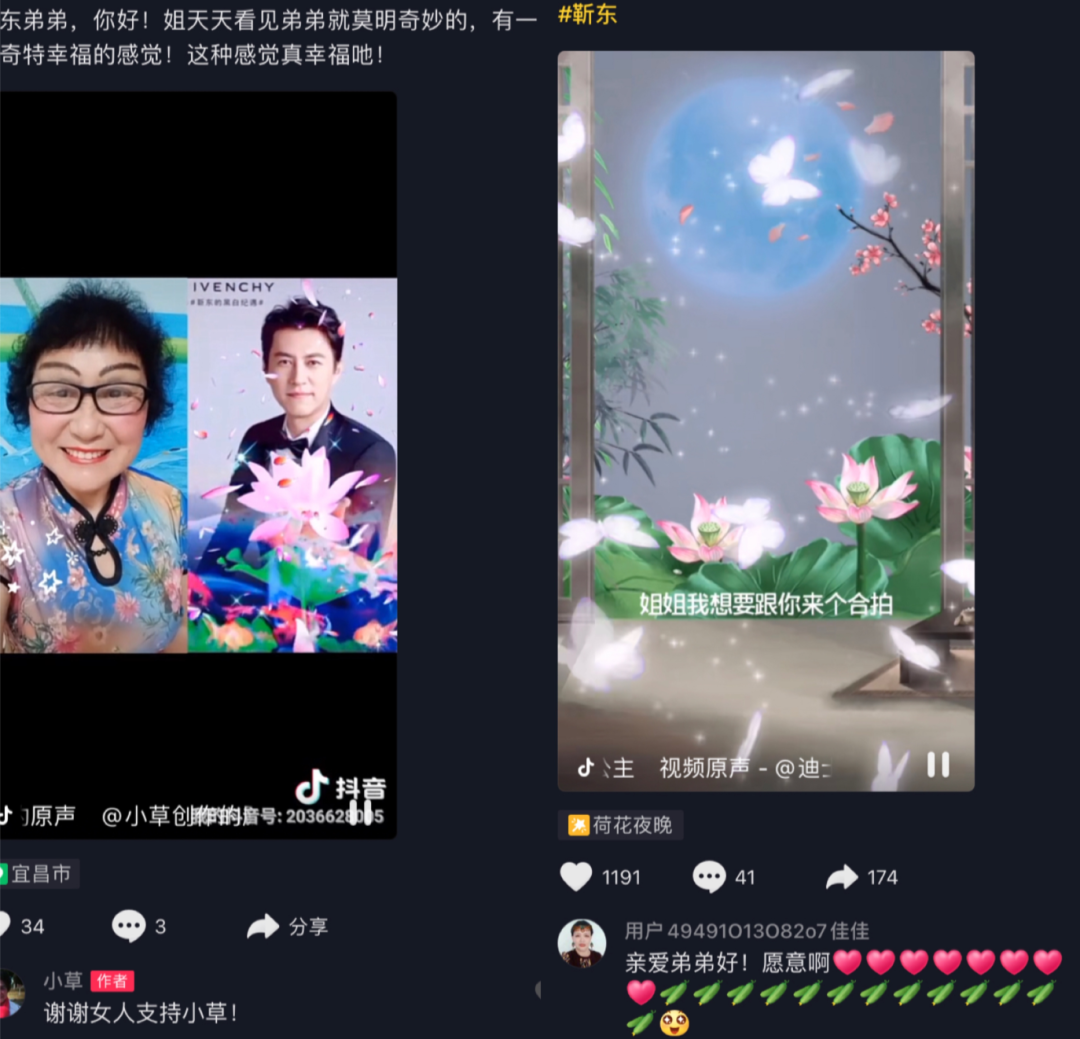 类似的视频极其容易复制,PS痕迹十分明显,里面的“靳东”,说话表情一样,衣服也是固定的一套,凭借蹩脚的花言巧语俘获了不少中老年阿姨的心,也都无一例外地获得了上千个点赞。“对不起都是我不好,原谅我好不?”“亲爱的东弟你好,谢谢你关爱我”,“东弟姐姐想你”,姐姐们真情实意地在评论区表白,从口吻判断多是中老年妇女。