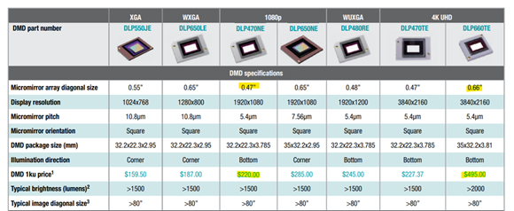 德州仪器有在官网上贴出每款芯片售价,一分钱一分货,越贵的芯片,做出的投影效果也好。