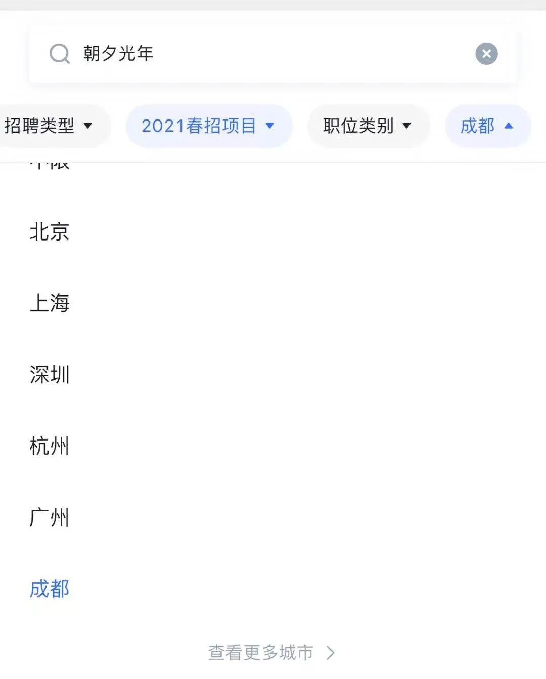 竞核查询朝夕光年招聘官网,发现工作地点除北京、上海、深圳、杭州四地工作室外,广州、成都也在列。