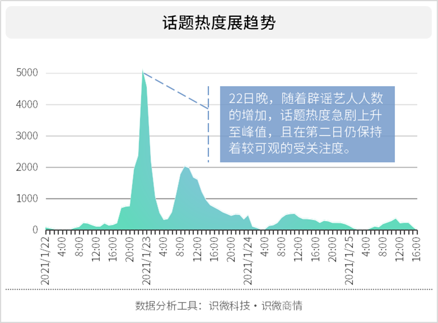 根据微博娱乐统计,微博热搜榜单几乎完全被明星话题占据,仅在2021年跨年夜当晚,艺人相关热搜就高达239个。此前,被郑爽连带出来的明星火速通过工作室、后援会、代理律师官方途径进行辟谣与追责警告,一时间的有关辟谣的多个词条连登热搜榜,话题热度急剧攀升至峰值。