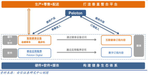 与Keep不同,Peloton是先做硬件设备,然后再搞内容。把跑步机等传统健身器械进行智能化,屏幕显示、内置音声系统,设备上加了软件订阅产品,这些可以使用户在运动中获得沉浸式体验。因此,Peloton被视为健身领域的苹果,软硬结合,通过销售硬件设备来赚内容的钱。