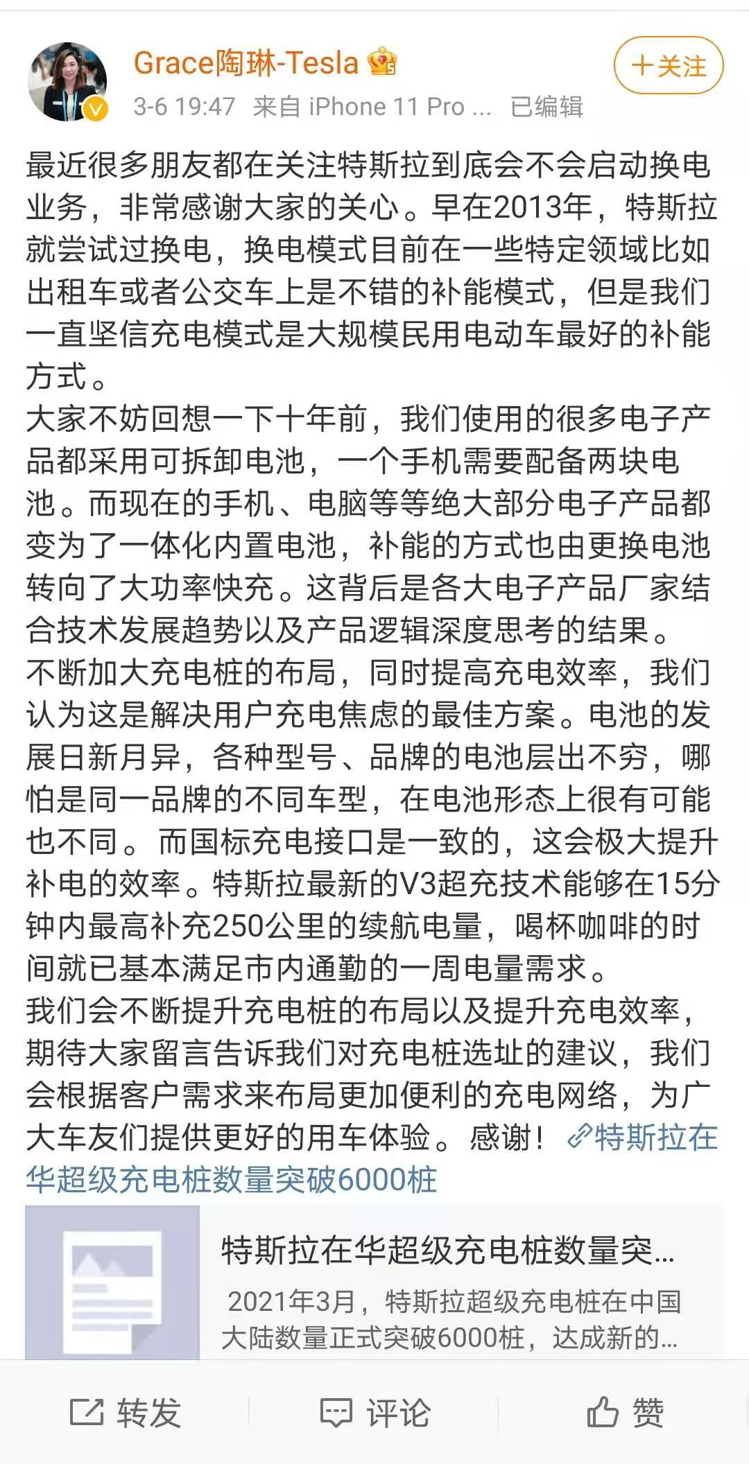 特斯拉全球副总裁陶琳在微博上回应“特斯拉是否会启动换电模式”