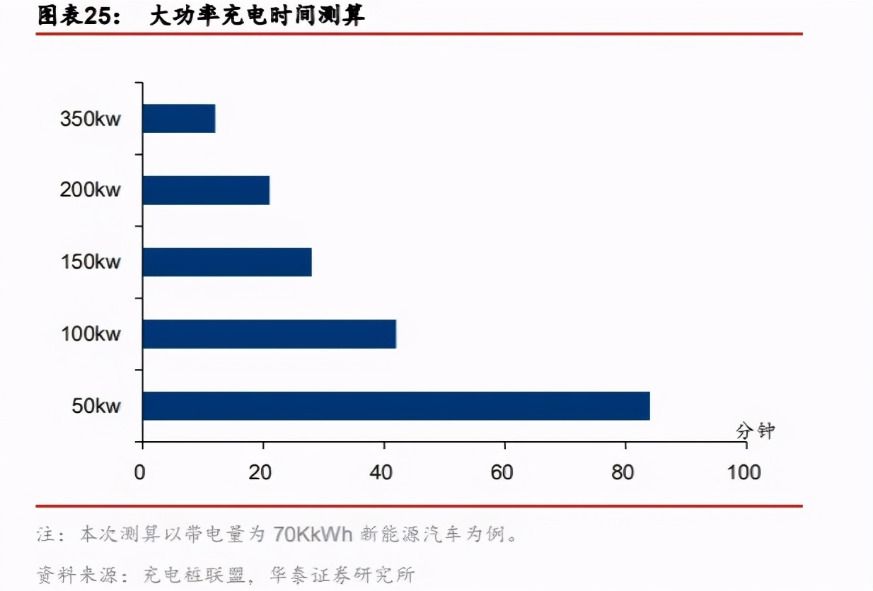 这两种规格的充电桩基本上算是市面上比较大功率的充电桩了。按照华泰证券做的充电时间测算,80kw、160kw的充电桩至少也得半个小时才能充满。
