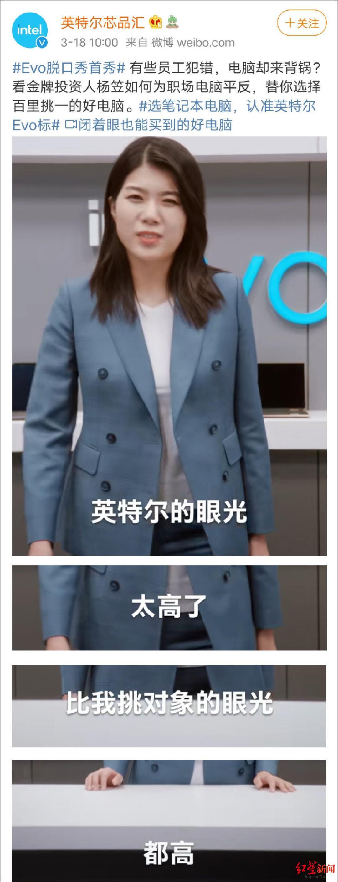 3月18号,英特尔发布微博推荐自家新品的EVO认证,请了脱口秀演员杨笠来配合宣传,并发布了一条短视频。官方的文案中含有“脱口秀”、“职场”、“平反”等词汇,明显是借用了杨笠脱口秀热度为英特尔带货的一只推广广告。