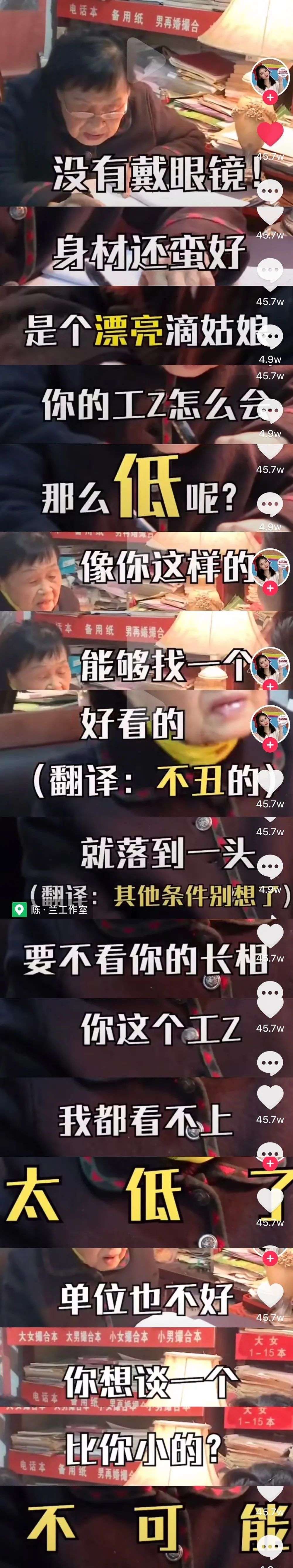 “你没有花香没有树高,就是你的长相, 我认为是一般,不是漂亮也不是丑,但你的个子都矮了。”面对自身外表条件一般,却对女孩长相苛求挑剔的男生,奶奶直截了当的让他直面现实。