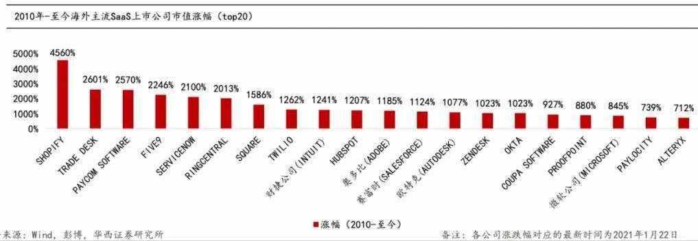 而美股对SaaS企业估值倍数之所以高,则在于美股SaaS企业给投资者带来的高回报。据统计,44家SaaS公司从2010-至今的美股上市公司涨幅,39家上涨,15家企业10年涨幅超过10倍。