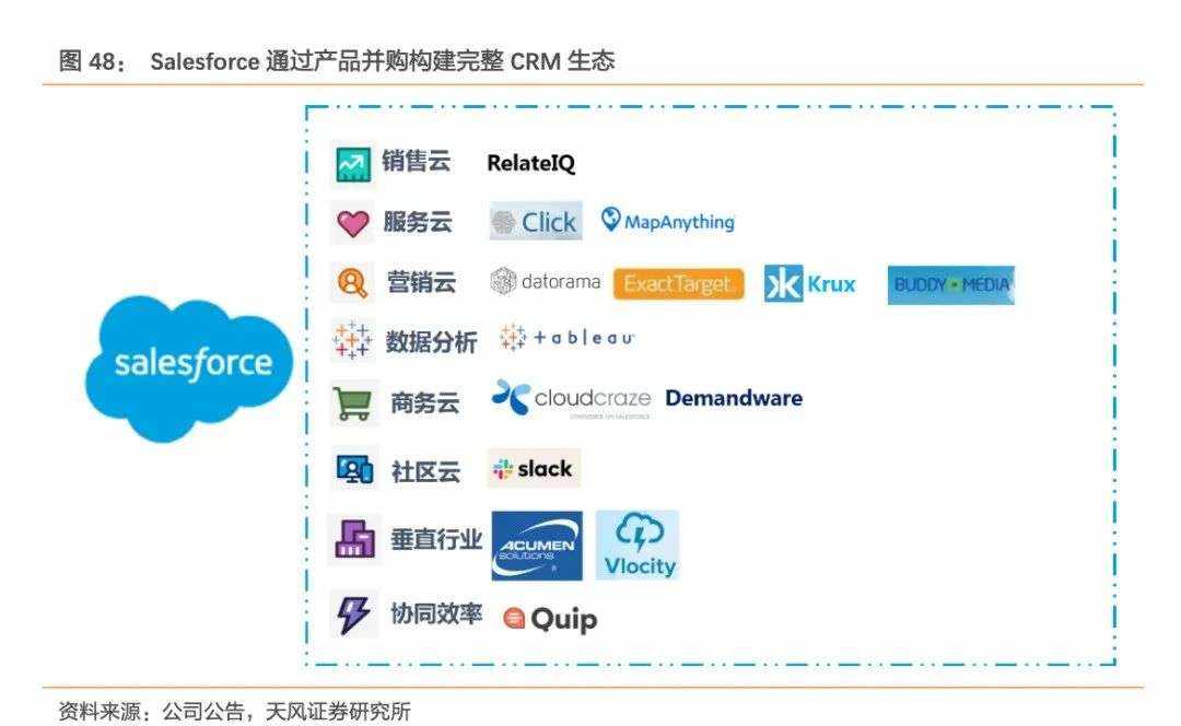 自上市以来,Salesforce通过持续收购不断扩充自身产品体系,提升产品竞争力,最终形成了如今以CRM云服务为核心的客户服务生态系统。Salesforce外延式增长大体上可分为两种:技术并购和产品并购,其中大部分技术类型并购主要发生在2008年至2012年间,在前期具备较强的底层技术框架后,Salesforce于2014年后开始进行频繁的产品并购,以实现产品种类的迅速扩张和CRM生态的搭建。