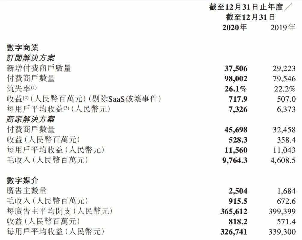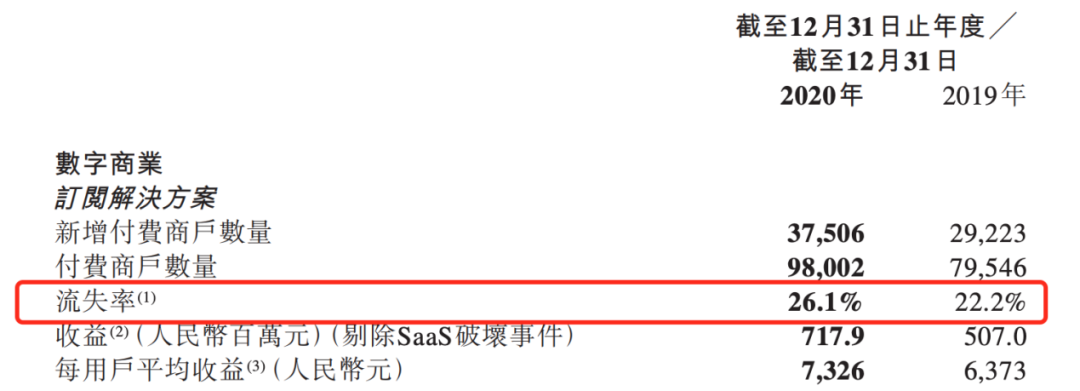 需要注意的是,随着ARPU提高,SaaS产品付费商家流失率或将提高。据财报显示,2020年付费商家流失率为26.1%,而2018年和2019年的数据为26.8%,22.2%,2020年付费商家流失率又回到了2018年的水平,后续在价格上升的前提下,用户粘性大概率还会下降。