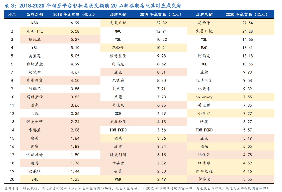 2020年天猫平台彩妆品类成交额TOP20中,花西子与完美日记力压众多国际大牌分别获得第一、第二名,此外Colorkey、小奥汀、橘朵等品牌也表现突出,均跻身前20名。