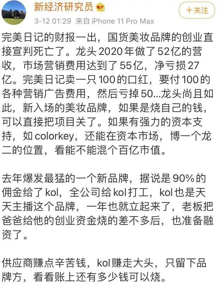 引发这种质疑的,是在微博、朋友圈广为流传的一张截图,截图内容真假掺半,用颇为内行的语气讲述了一个耸人听闻的观点——完美日记卖一只100(元)的口红,要付100(元)的营销广告费用,然后亏掉50(元),结论是:国货美妆品牌只是一场烧钱游戏,可以原地关停了。