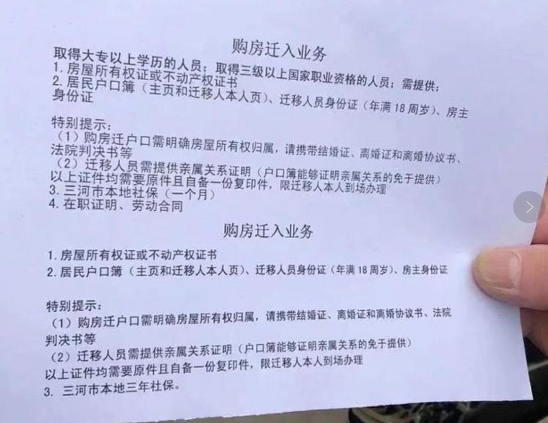 紧接着,3月18日,该政策就被调整为除了房本以外,还需要“有大专以上学历或取得三级以上国家职业资格人员,三河市本地社保一个月”等条件。