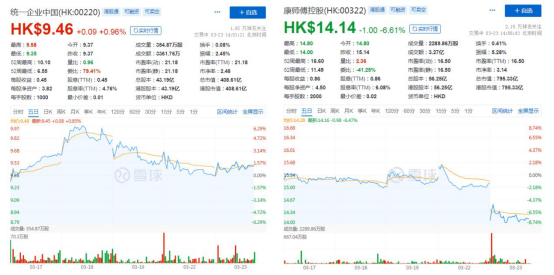 财报公布后,二者的股价走势也略有不同。统一于3月19日港股盘后公布财报,3月22日港股开盘后,股价整体表现较为平稳,截至目前,报9.46港元,总市值408.61亿港元;而康师傅财报公布后次日,跌幅较为明显,截止目前跌超6%,报14.14港元。