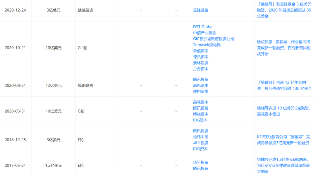 猿辅导部分融资情况,图源天眼查