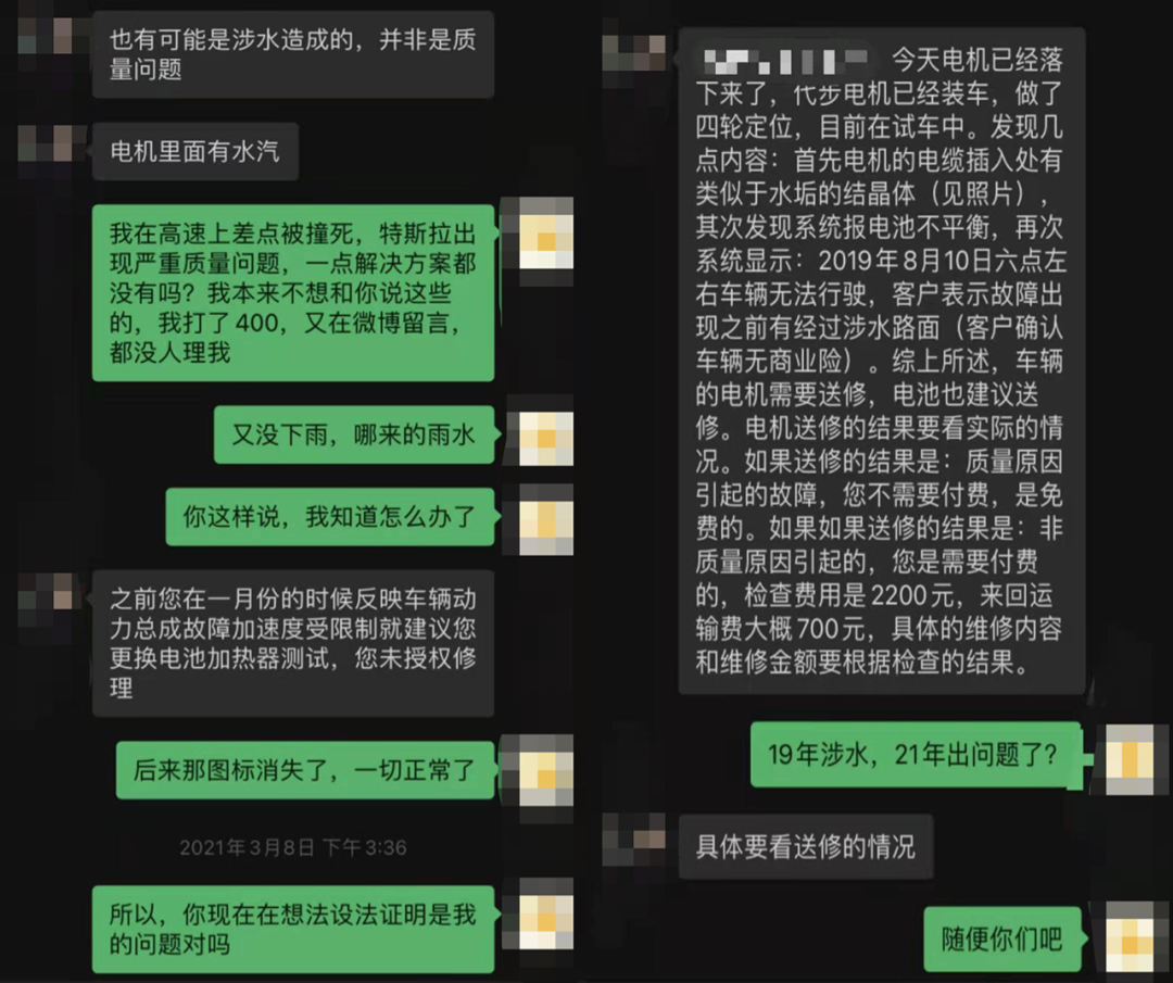 张鸥与特斯拉工作人员交谈的微信截图,受访者供图