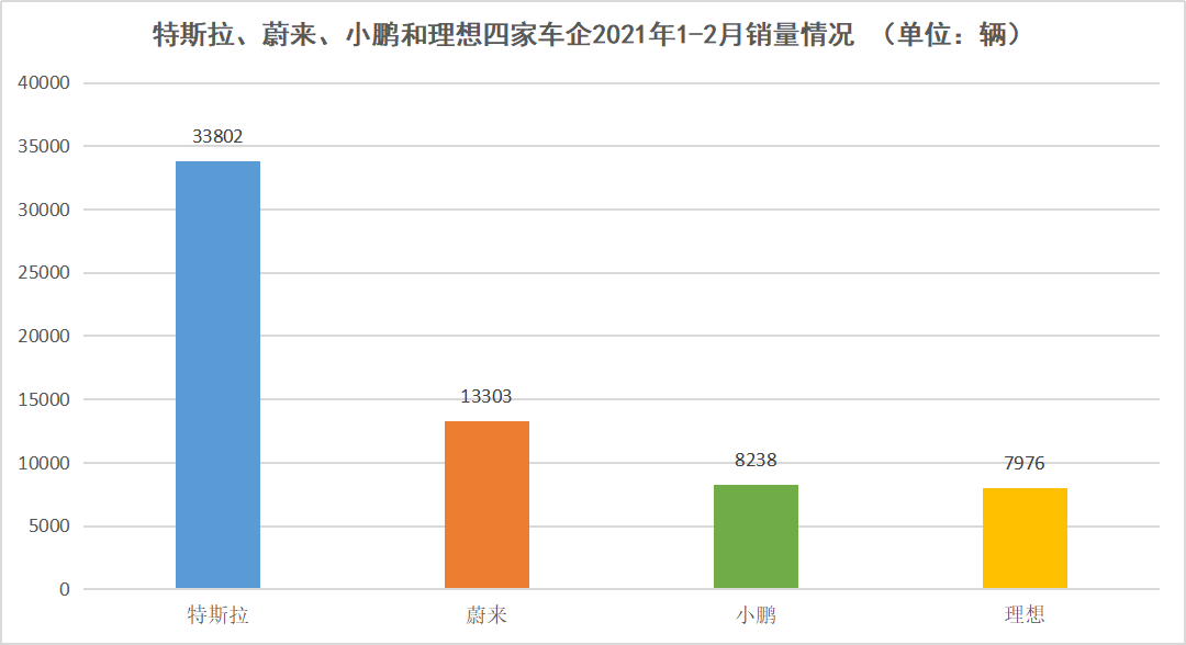 这点从特斯拉今年的国内销量数据中就可以窥见一二。据乘联会数据显示,特斯拉2021年1-2月的国内销量分别为15484辆和18318辆,总销量为33802辆。相比之下,蔚来、小鹏和理想三家车企今年前两月的销量分别为13303辆、8238辆和7679辆,均与特斯拉同期销量有较大差距。