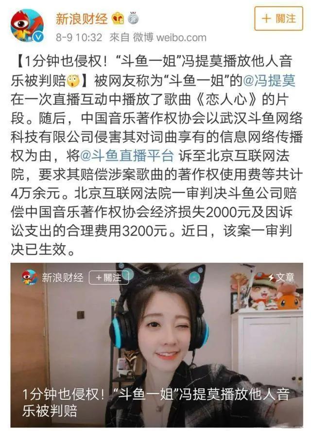 此后,直播平台、MCN机构和主播受侵权指控的事件频发。2019年音乐版权商业发行平台VFine Music起诉短视频MCN机构papitube,控告后者侵犯日本独立音乐厂牌Lullatone的录音录像制作者权;半个月后,音著协起诉斗鱼平台主播冯提莫在直播中播放由张超作词、曲的歌曲《恋人心》1分10秒(歌曲全长3分28秒)。