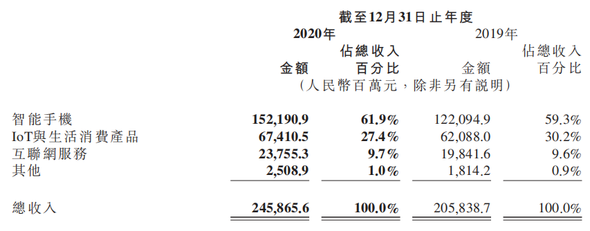 在手机之外,另外两大主营业务也依旧处于增长中。不过,“IoT与生活消费产品”业务的营收占比在缩小,同比缩小2.8%;互联网服务业务收入的毛利率在下降,2020年,小米互联网服务业务毛利率为61.6%,上年同期为64.7%。