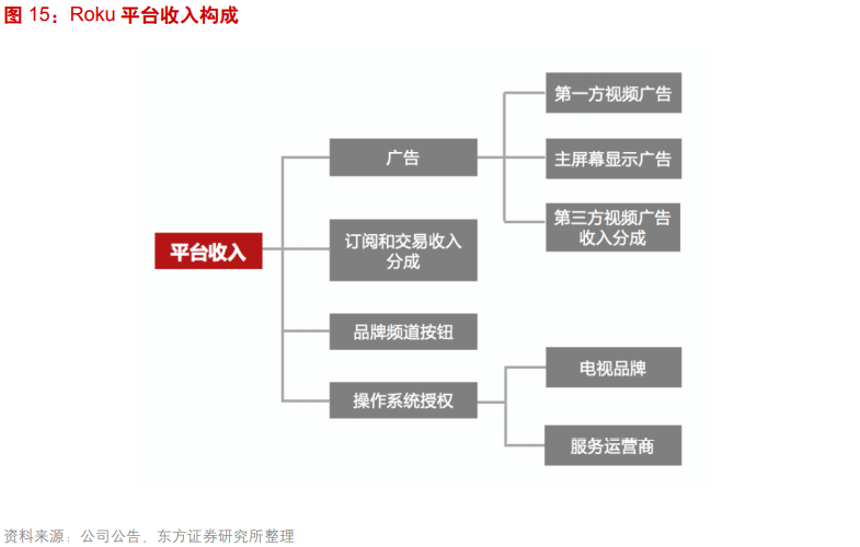 据财报说数据显示,自2018年后,Roku的毛利率一直维持在40%之上,这一整体毛利率的提升源于平台业务的拉动。东方证券报告中显示,Roku的平台收入构成主要包括四个方面,广告、订阅和交易收入分成、品牌频道按钮以及操作系统授权。