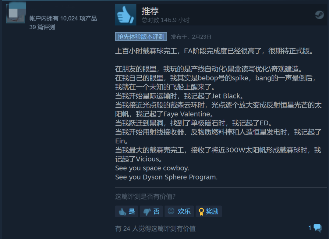 这是一位玩家为模拟经营游戏《戴森球计划》写下的评价,这款游戏让他想起了日本著名科幻动画《星际牛仔》。Steam评价页面中,类似的好评比比皆是。玩家们用他们的科幻情怀歌颂着这样一款具有太空歌剧气质的作品。