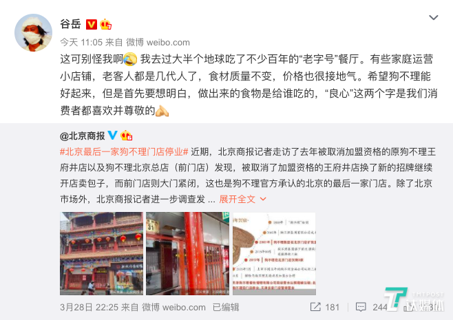 去年发布“狗不理”王府井店视频的博主谷岳也评论表示:这可别怪我啊, 我去过大半个地球吃了不少百年的“老字号”餐厅。有些家庭运营小店铺,老客人都是几代人了,食材质量不变,价格也很接地气。希望狗不理能好起来,但是首先要想明白,做出来的食物是给谁吃的,“良心”这两个字是我们消费者都喜欢并尊敬的。