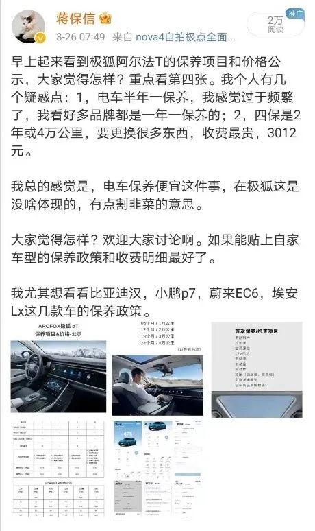 3月29日,蒋保信在自己的公众号《电动汽车用户联盟》发文回顾梳理了事件经过。蒋保信是一位极狐阿尔法T车主,3月26日早上,因对极狐APP里公示的保养政策细则有一些疑问,在自己的自媒体社群中、在微博上作了一些讨论。