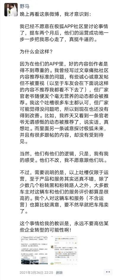 晚上10点多时,蒋保信又吐槽了一下,表示自己已经不愿意在极狐App社群里讨论事情了,“提车两个月后,他们的运营成功地一步一步把我恶心走了,真挺牛逼的。”
