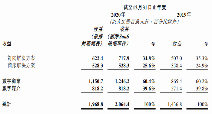 3月17日,微盟发布2020年财报,披露微盟2020收益19.688亿元,其中数字商业领域(订阅解决方案+商家解决方案)付费商户数为9.8万,贡献收益11.507亿元,占总营收的58.44%;数字媒介领域广告主数量为2504家,贡献收益8.182亿元,占总营收比重为41.55%。