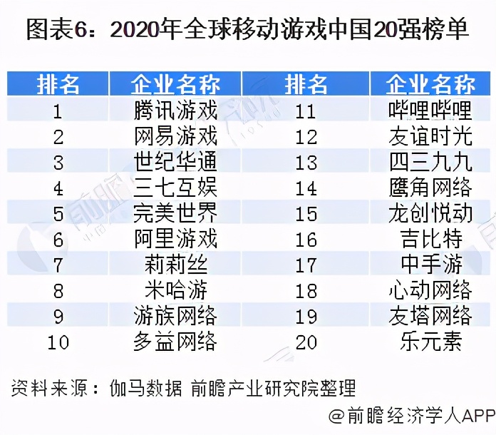 根据伽马数据显示,2020年全球移动游戏中国20强榜当中,前五名分别为腾讯、网易、世纪华通、三七互娱、完美世界,而近几年大放异彩的米哈游、莉莉丝则在第七和第八。