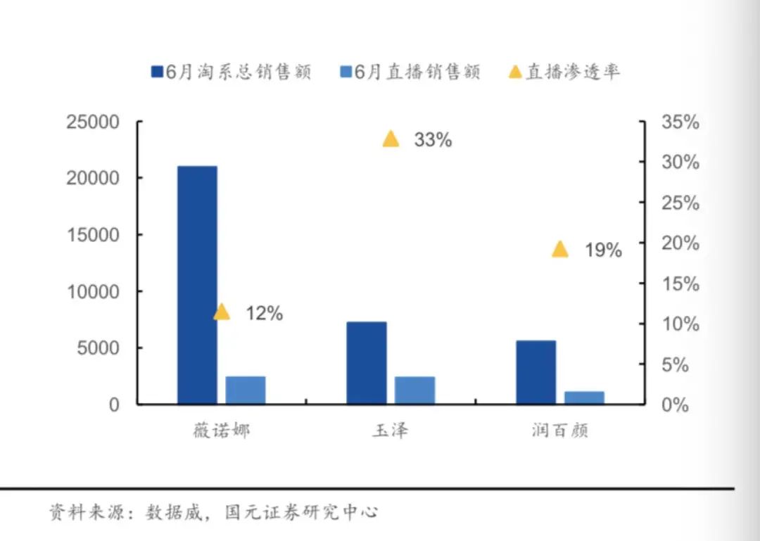 国元证券的数据显示,2020年6月,玉泽淘系平台直播销售额占品牌销售额的比例达到33%,远高于竞品品牌薇诺娜。