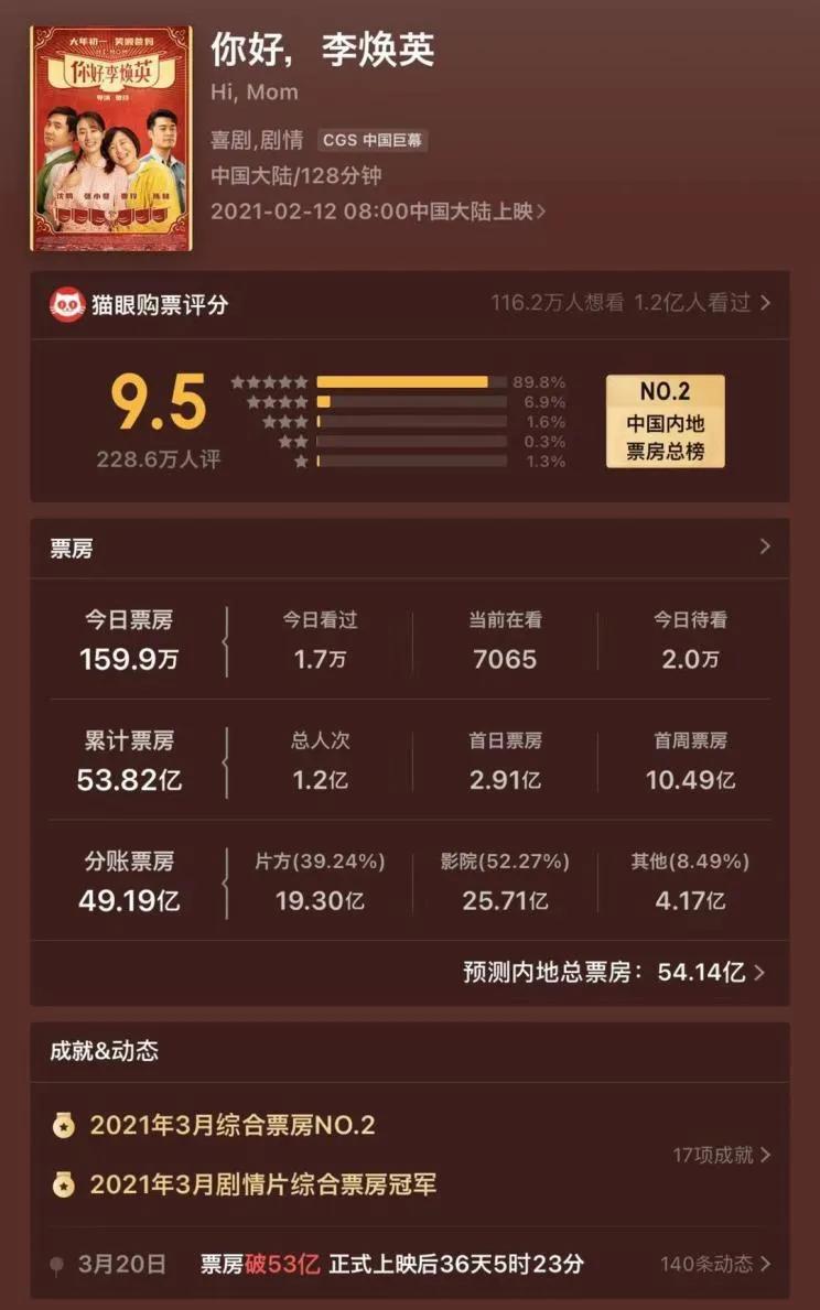 今年春节档的7部影片中,猫眼娱乐以出品或发行的方式参与了其中5部影片。其中,由猫眼参与出品和保底主控发行的《你好,李焕英》的累计票房已经超过53亿元。随着院线市场继续复苏回暖,春节档几部参与影片的良好表现或能为猫眼带来不错收益。