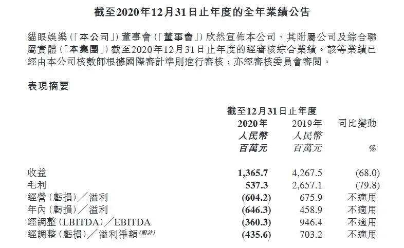 根据猫眼娱乐2020业绩公告,猫眼娱乐2020年公司总营收13.657亿元人民币,同比下滑68%。经调整全年亏损净额为4.356亿元人民币,去年同期收益净额为7.032亿元。