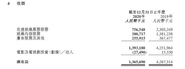 其中,作为猫眼娱乐核心业务的在线娱乐票务服务和上游内容的娱乐内容服务两大业务版块的收益缩减最为严重,仅剩前一年的不足四分之一。2020年在线娱乐票务服务收益由为7.57亿元,较19年的23.03亿元下降67.2%;娱乐内容服务所得收益为3.53亿元,较19年的13.97亿元下降74.7%。