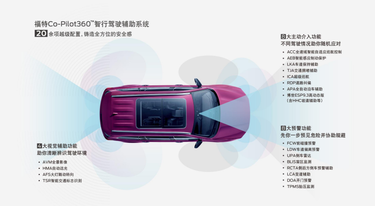 同时,领裕还搭载了福特性能强劲的2.0T EcoBoost®直列四缸涡轮增压直喷发动机,表现参数为额定功率165kW,最大扭矩360N·m;以及搭载了福特最主流的Co-Pilot 360智行辅助驾驶系统,在多达20多个传感器,以及高效车载芯片的加持下,领裕可实现20余项智能驾驶辅助技术,完全支持前、后、侧三向辅助停车。