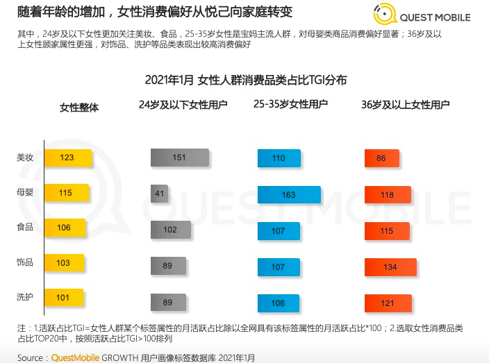 从QuestMobile《2021她经济洞察报告》也可以看出,36岁及以上女性的主要花销,除了母婴、洗护和食品之外,美妆和饰品都榜上有名,其中饰品占比最高。这样的答案多多少少有些出人意料,但又在情理之中。如何“优雅地变老”,成了妈妈们现阶段最大的梦想。