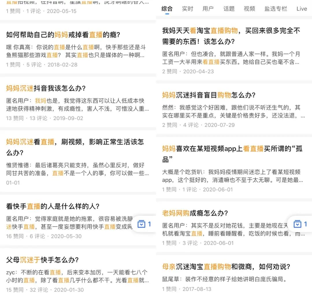 老妈们“沦陷”直播间,并不是个别现象,在知乎上只要输入“妈妈”“直播”“沉迷”等关键词,就会出现一长串帖子,“妈妈沉迷抖音盲目购物怎么办?”“我妈天天看淘宝直播购物,怎么办?”“妈妈沉迷看直播,影响正常生活该怎么办?”