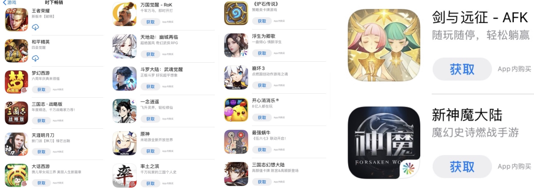 A股们的“边缘化”也体现在产品端。截至4月3日,ios畅销榜前20名,仅有三七互娱于3月份上线的IP手游《斗罗大陆:武魂觉醒》以及完美世界的《新神魔大陆》入榜。事实上,这样的情况已持续一定时间,畅销榜的熟面孔往往被几家头部厂商与中生代们“承包”,中生代游戏公司的产品同样占比不小,包括莉莉丝的《万国觉醒》《剑与远征》、米哈游的《原神》《崩坏3》。