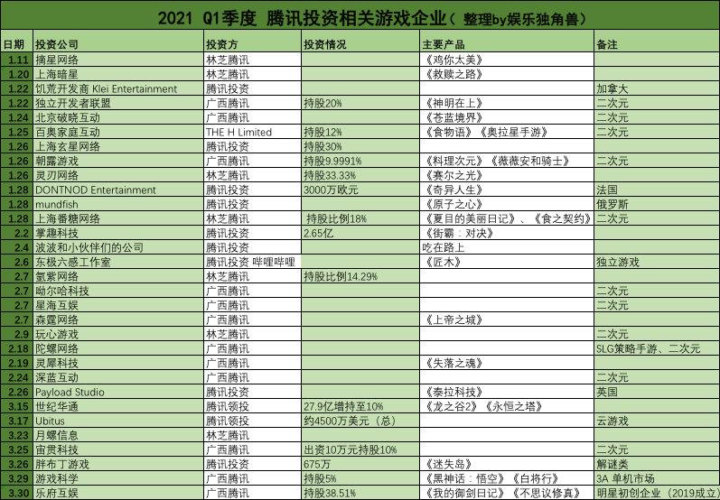 事实上,在2021年刚过去的三个月里,游戏投资领域风云突变。仅由腾讯发起的游戏相关投资便多达31起。娱乐独角兽根据公开信息,整理了2021年第一季度腾讯在游戏领域的投资。可以看到,这31家游戏公司,以二次元CP公司、海外开发商、3A潜力团队及A股头部的数量依次排列。
