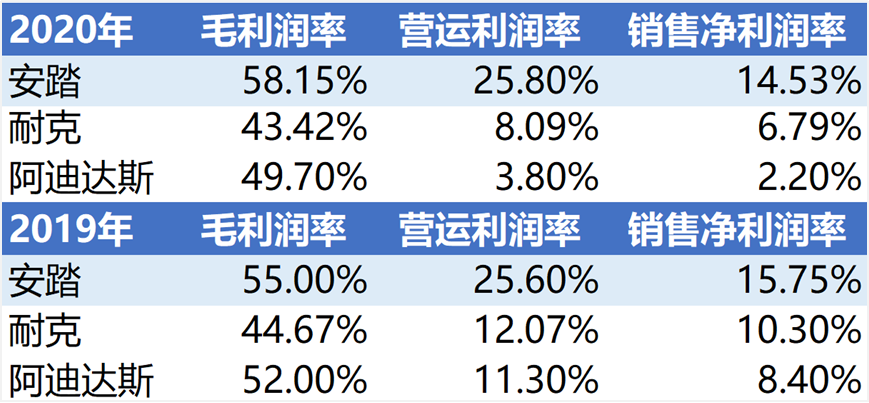 总结下来,安踏体育在营收规模上还远赶不上耐克、阿迪,但是利润率却显著高于这两家,所以在2020年疫情的影响下,安踏的利润超过了阿迪达斯。