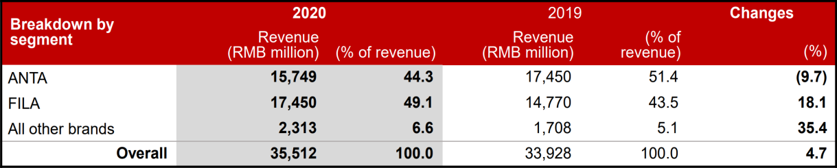 再看2020年的营收结构,FILA的营收贡献率为49.1%,已经完全超过了主品牌安踏的44.3%。经营利润方面,FILA贡献的44.94亿元已经和安踏的44.49亿元旗鼓相当了。