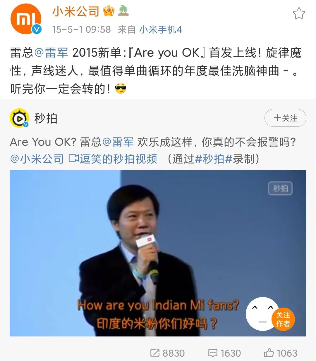 2015年,雷军凭借着在印度新品发布会上的一句“Are You OK?”成功火遍大江南北,并通过鬼畜视频《跟着雷总摇起来!Are you OK!》,雷军也极大的拉近了与年轻人群体的距离。