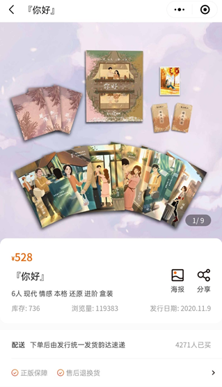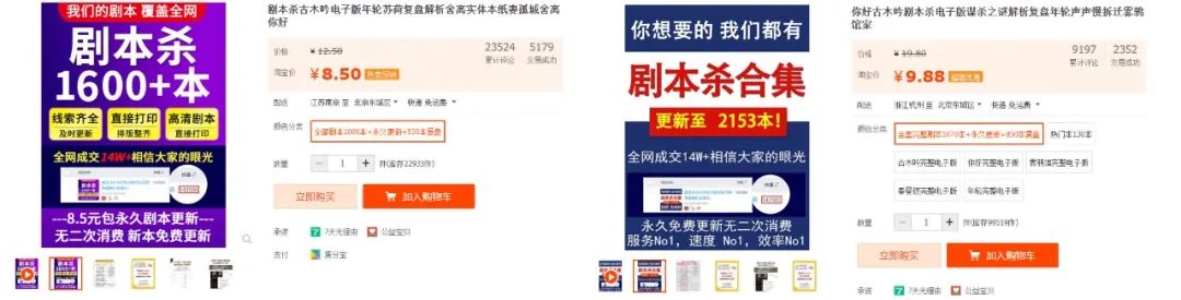 在淘宝上,《你好》、《古木吟》等1070本全套完整剧本售价9.88元,交易成功显示2352本,累计评论9197个。还有《古木吟》、《年轮》等1000本的合集,售价8.5元,交易成功5179本,累计评论23524个。