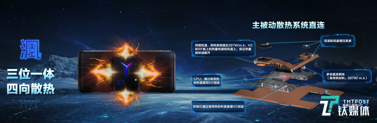 “渢”为中置热源设置超大液冷VC散热,从而实现由中间到两侧的快速均热。内置纯铜密闭风道,纯铜材质散热效率是普通材质的十倍以上,同时在独特T型风道设计的加持下,可进一步延长机身内热交换时间,带走更多热量。