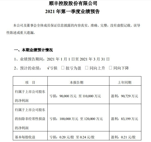 2021年4月8日晚,顺丰控股发布了公司2021年第一季业绩预告。一季度,归属于上市公司股东的净利润亏损9亿元至11亿元,去年同期盈利9.07亿元;归属于上市公司股东的扣除非经常性损益的净利润亏损10亿元至12亿元,去年同期盈利8.32亿元;基本每股收益亏损0.20元/股至0.24元/股,去年同期盈利0.21元/股。