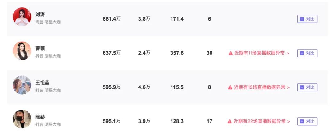 曾一度称霸淘宝带货界的“刘一刀”刘涛,近30天就只直播了两场带货,场均销售额仅有609.5万;去年战绩稳定的李诞最近一次直播还得追溯到1月17日,已接近三个月未开播,而他那次直播也仅拿下927.68万的销售额;而至于陈赫、戚薇等人,他们每月都仅能保留一至两场直播。